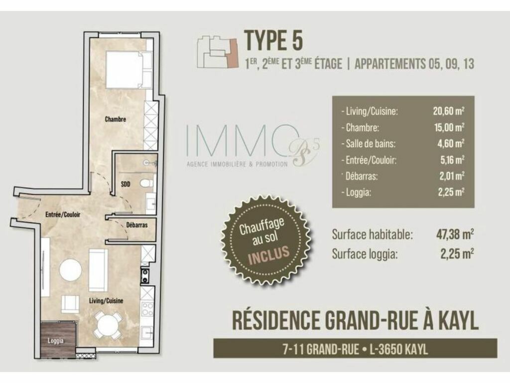 IMMODS5 vous propose en vente un appartement en vente dans une nouvelle résidence Grand-Rue à Kayl, en future état d’achèvement (VEFA).