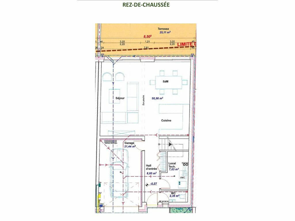 - Au rez-de-chaussée la maison dispose d’un vaste séjour avec cuisine ouverte donnant accès sur la terrasse, WC séparé, garage et local technique.