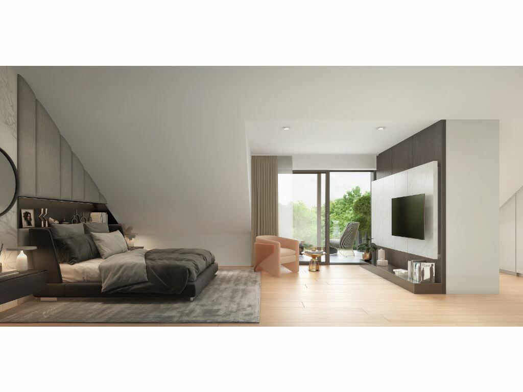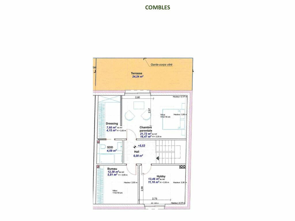 - Le 2ème étage est réservé à la chambre parentale avec terrasse, dressing, salle de douche, bureau et local « hobby ».